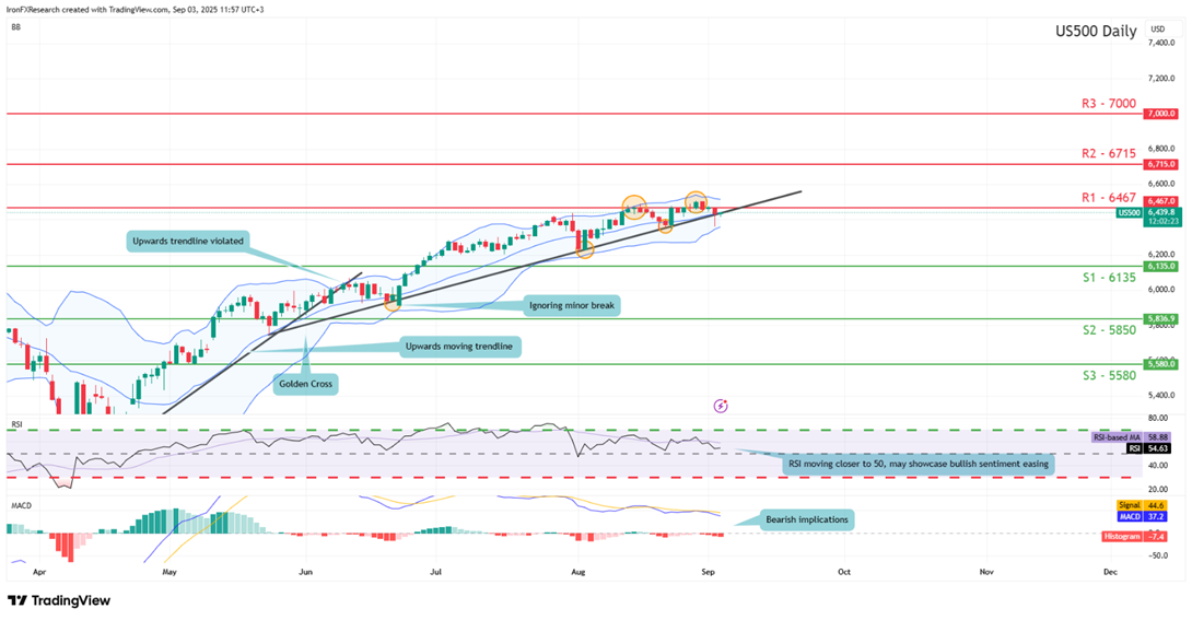 The US500 appears to be moving in a sideways fashion after failing to remain above our 6467 (R1) resistance level. We cautiously opt for a sideways bias for the index and supporting our case is the RSI indicator below our chart which currently registers a figure near 50, implying a neutral market sentiment. However, for our sideways bias to be maintained our upwards moving trendline must be invalidated. Moreover, in our sideways bias scenario, we would require the index to remain confined between our 6135 (S1) support level and our 6476 (R1) resistance line. On the other hand, we would immediately opt for a bullish outlook in the event that our upwards moving trendline continues to be respected in addition to a clear break above our 6467 (R1) resistance line with the next possible target for the bulls being our 6715 (R2) hypothetical resistance level. Lastly, for a bearish outlook, we would require a break below our 6135 (S1) support line with the next possible target for the bears being our 5850 (S2) support level.