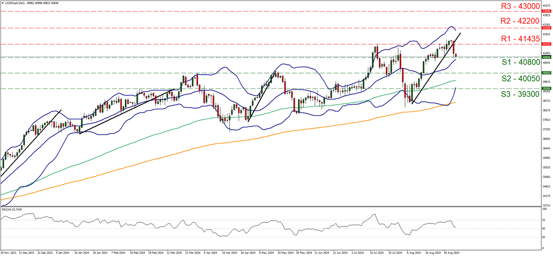Dow Jones tumbled yesterday breaking the 41435 (R1) support line, now turned to resistance and continued lower testing the 40800 (S1) support level. Given that the downward motion of the index, clearly broke the upward trendline guiding it since the 8th of August, we switch our bullish outlook in favour of a sideways motion bias initially. Also the RSI indicator dropped from the highs of almost 70 to just above the reading of 50 implying that the bullish sentiment of the market eased if not has faded away. Yet the drop of the RSI also implies that a bearish sentiment has yet to be build up. For a bearish outlook we would require index’s price action to break clearly the 40800 (S1) support line and start aiming for the 40050 (S2) support base. Even lower we note the 39300 (S3) support barrier. Should the bulls regain control over the index, we may see it breaking the 41435 (R1) resistance line and set as the next possible target for the bulls the 42200 (R2) resistance level.