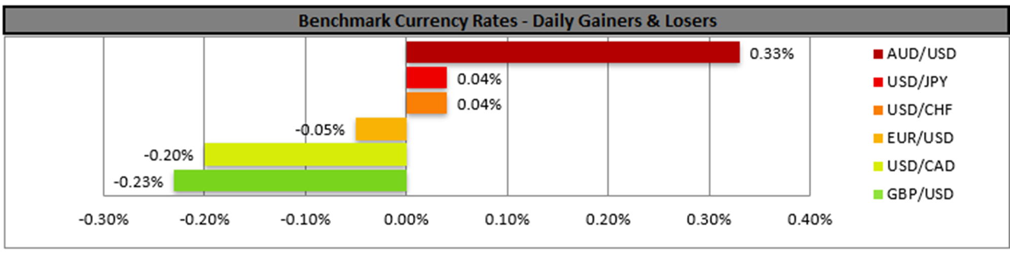 On a technical level, EUR/USD maintains a sideways motion just above the 1.0615 (S1) support line. Nevertheless we note that the pair moves in a wide downward channel, while at the same time the RSI indicator remains near the reading of 30 implying a residue of a bearish sentiment among market participants. Also please note that the 20 moving average (MA) and the 100 MA (green line) are pointing downwards implying the possibility of a continuance of the bearish movement. Yet for the bearish outlook to be verified we would require the pair to break the 1.0615 (S1) support line and aim for the 1.0450 (S2) support level. Should for any given reason, the bulls find a chance and take over the reins of the pair’s direction, we may see the pair reversing course and breaking the 1.0740 (R1) resistance line thus paving the way for the 1.0890 (R2) resistance level.