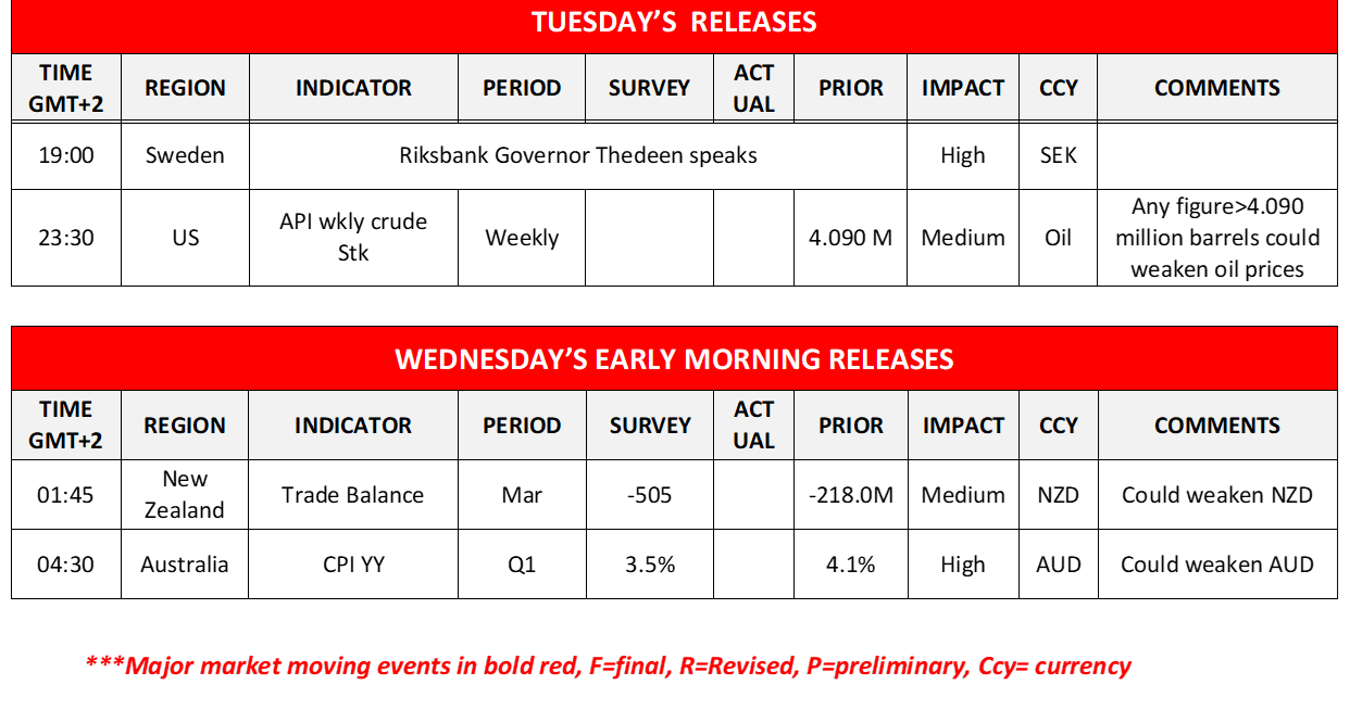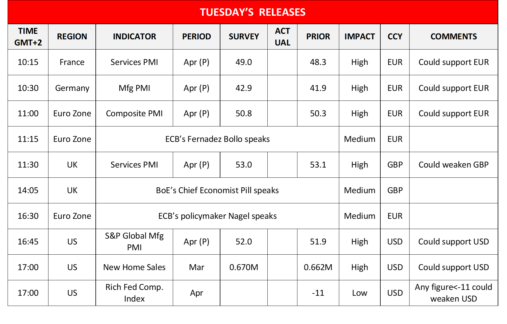 Today we get the preliminary PMI figures for April of the UK and from the US we get the preliminary S&P global PMI figures for April, March’s New Home sales figure and Richmond Fed Composite Index for April while we also note the release of the weekly US API crude oil inventories figure for oil traders. On the monetary front, we note that ECB’s Fernandez Bollo, BoE’s Chief Economist Pill, ECB’s policymaker Nagel and Riksbank Governor Thedeen are scheduled to speak. In tomorrow’s Asian session, we get New Zealand’s trade data for March and we highlight the release of Australia’s CPI for Q1.