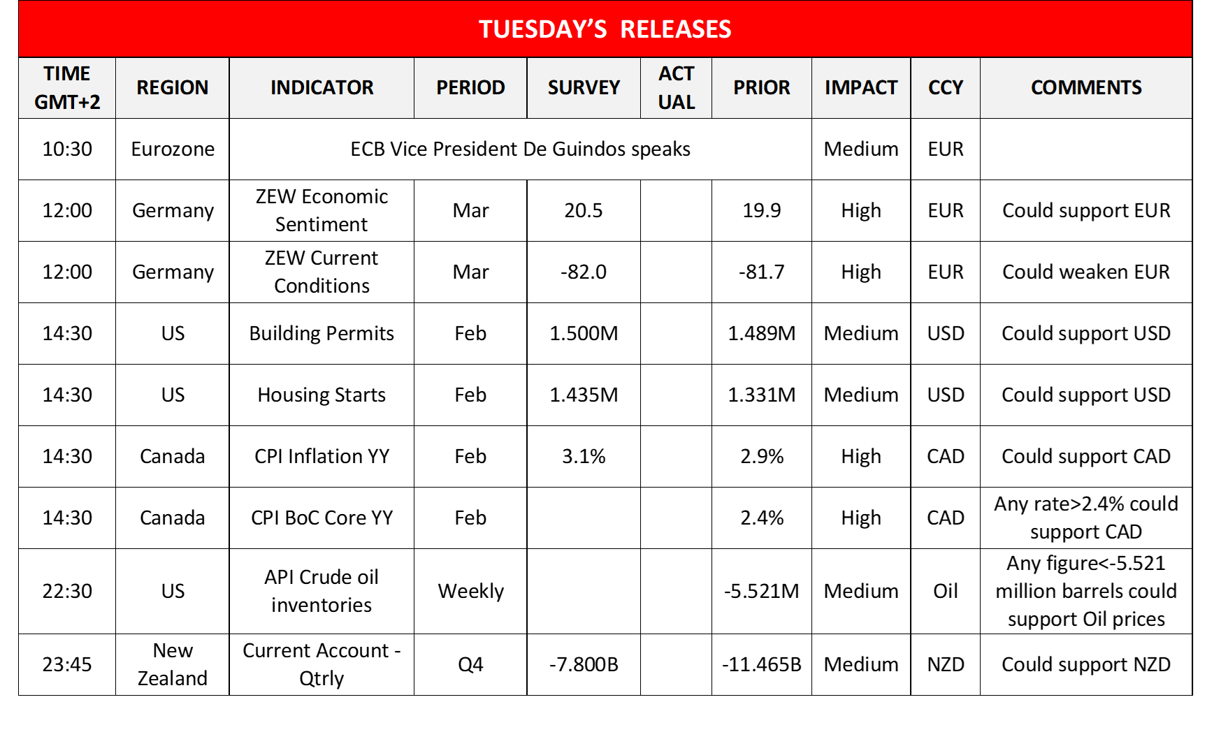 Today in the European session, we note the release of Germany’s ZEW indicators for March, while on the monetary front, ECB Vice President De Guindos speaks. In the American session, we get from the US the number of building permits and House starts for February, while later on we get New Zealand’s current account balance for Q4. Oil traders on the other hand, may be more interested in the release of the API weekly crude oil inventories figure. During tomorrow’s Asian session, we get from China PBoC’s interest rate decision.