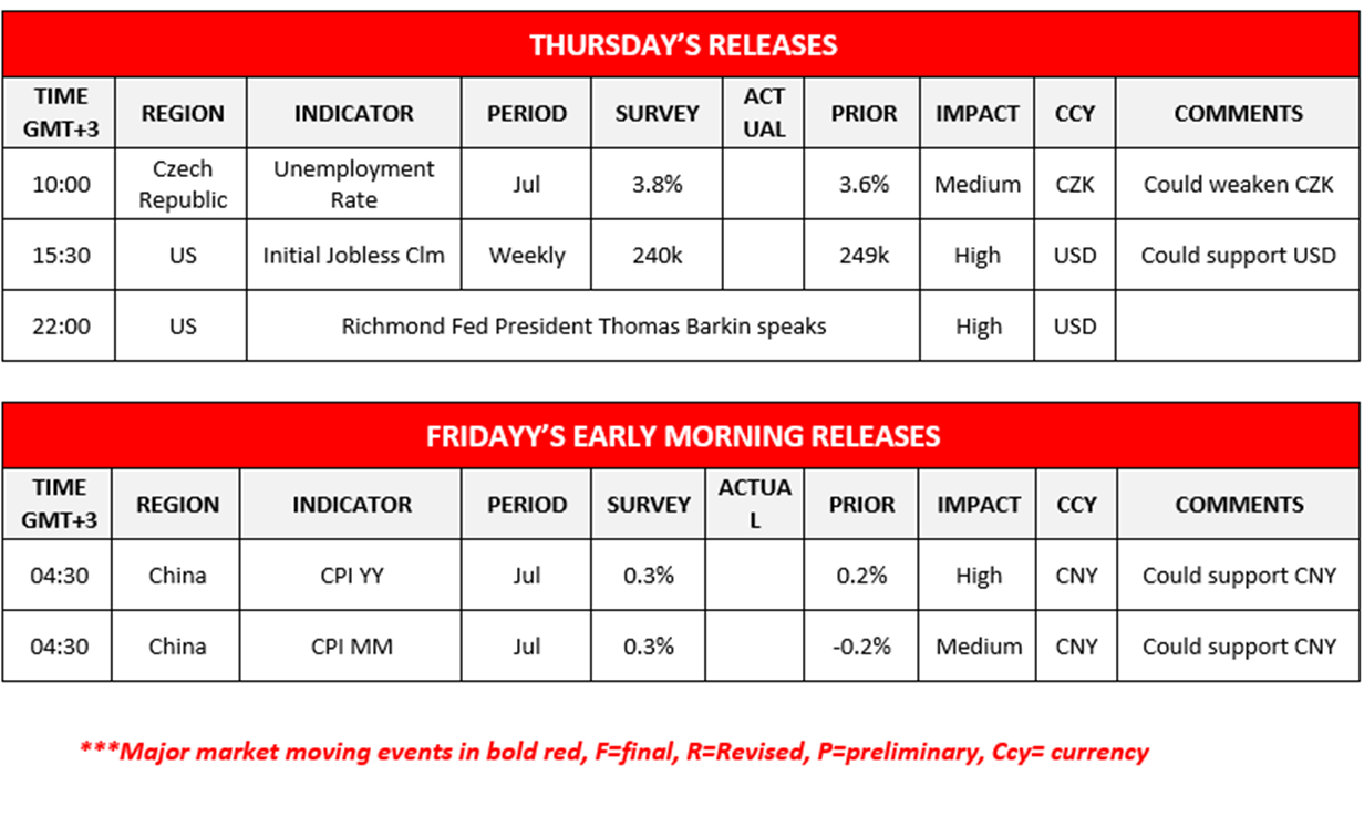 Today in the European session, we get the Czech Republic’s unemployment rate and during the American session we get the US weekly initial jobless claims figure. In tomorrow’s Asian session we get China’s CPI rates for July. On a monetary level we note the speech by Richmond Fed President Barkin in today’s late American session.