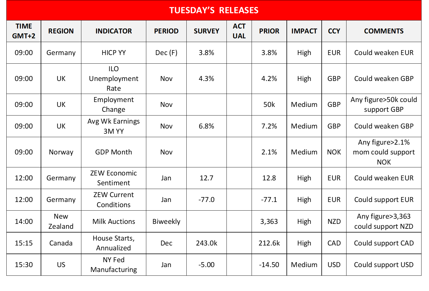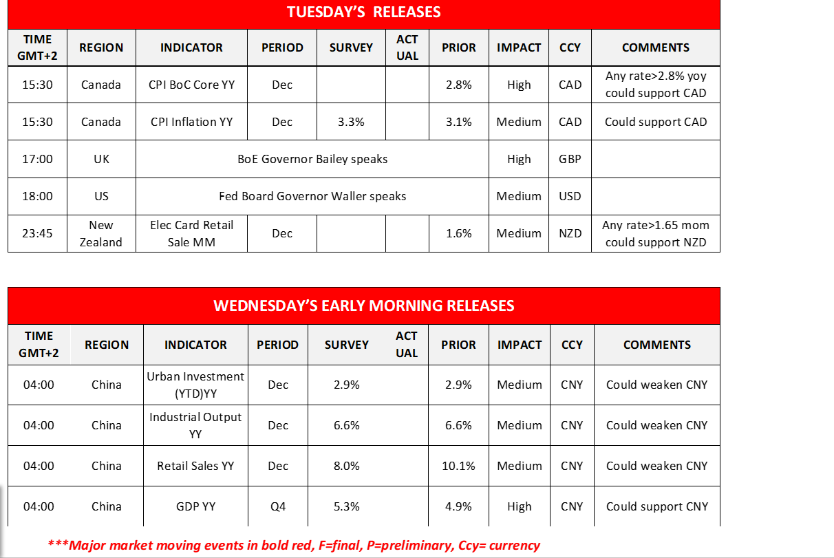 Today in the European session, we make a start with Germany’s final HICP rate for December and continue with Norway’s GDP rate for November, Germany’s January ZEW indicators and New Zealand’s milk auction figure. In the American session, we get Canada’s CPI rates and number of House starts, both being for December, the US NY Fed manufacturing index for January and later on New Zealand’s December electronic card retail sales growth rate. On the monetary front, we note that BoE Governor Bailey and Fed board governor Waller are scheduled to speak. During tomorrow’s Asian session, we note from China the release of December’s urban investment, industrial output, and retail sales growth rates and we highlight the GDP rate for Q4.
