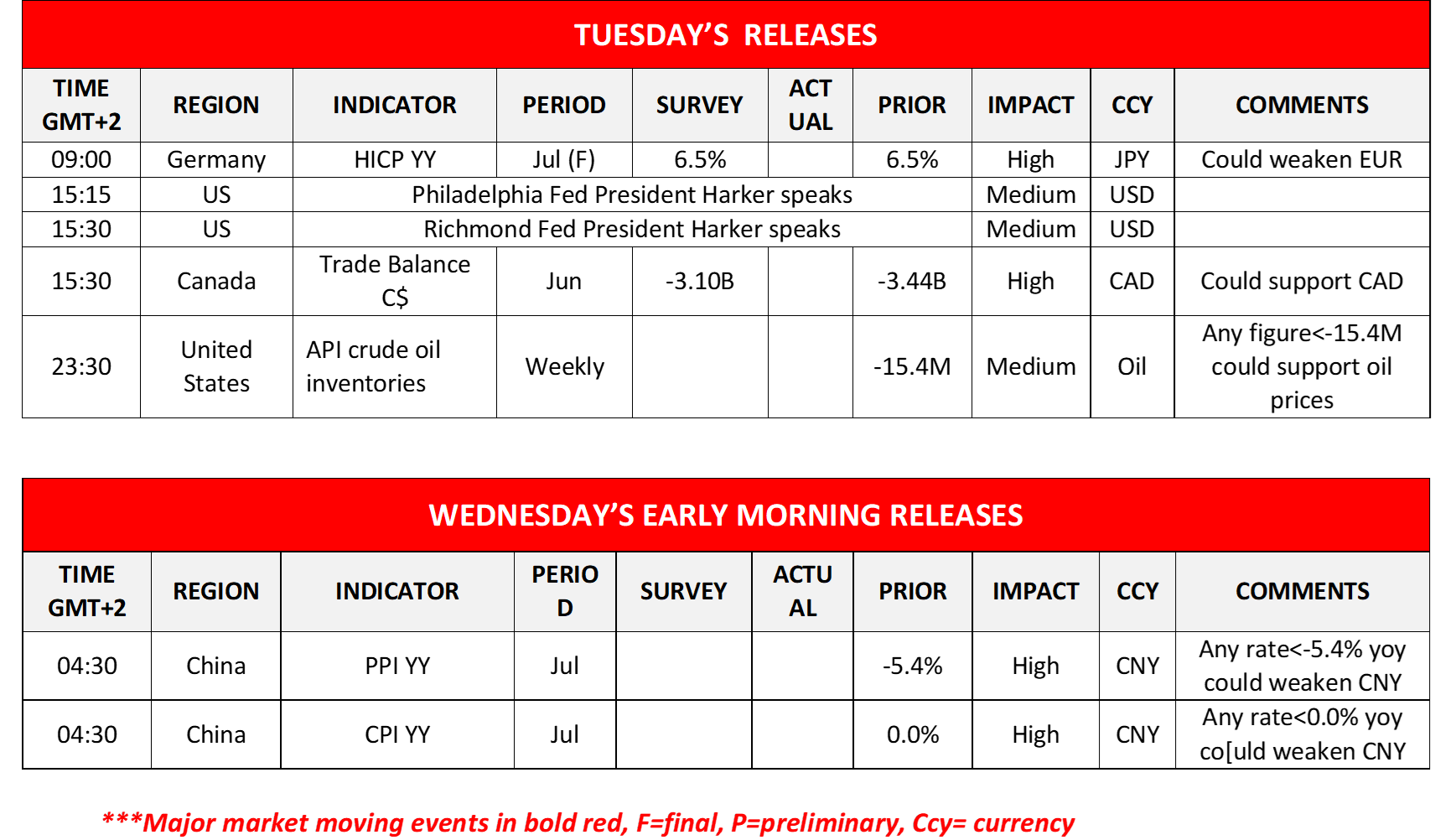 Today in the European session, we note the release of Germany’s final HICP rate for July. Oil traders may be more interested in the release of the weekly API crude oil inventories figure. During tomorrow’s Asian session, we note the release of China’s inflation metrics for July.