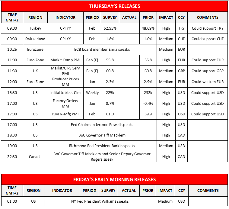 The indicator’s reading is expected to rise and reach 61.0, if compared to January’s 59.9 and if so could support the USD as it would imply that economic activity in the US services sector expanded at a faster pace in February than in January, thus providing some support for the greenback. At the same time, we also get the US factory orders growth rate for January. The rate is expected to get out of the negatives, accelerate and reach 0.7% mom if compared to January’s -0.4% mom. Should the actual rate meet its respective forecast or accelerate even further, we may see the USD getting some support as the rate would imply growth once again for the US manufacturing sector. Before that though we also get from the US the initial jobless claims figure for past week and the indicator’s reading is forecasted to drop, implying that the US employment market continued to tighten in the last full week of February and thus provide some support for the USD.