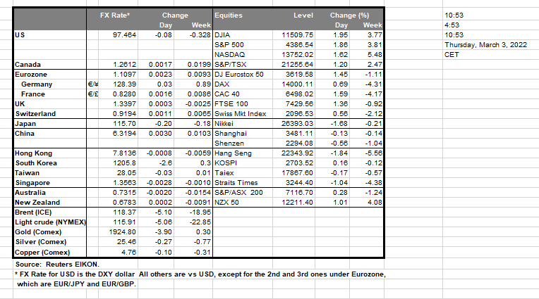 US stockmarkets were on the rise yesterday as Fed Chairman Powell yesterday testified before the House of Representatives. The Fed Chairman in his testimony indicated flexibility for the Fed’s rate hike path which may not have been the solid hawkish signal the markets may have been expecting. In his testimony the Fed Chairman also highlighted the uncertainty created from the crisis in Ukraine by stating that “The conflict is causing tremendous hardship for the Ukrainian people. The implications for the U.S. economy are highly uncertain, and we will be monitoring the situation closely”. In the American session today, we get from the US the ISM non-manufacturing PMI figure for February.