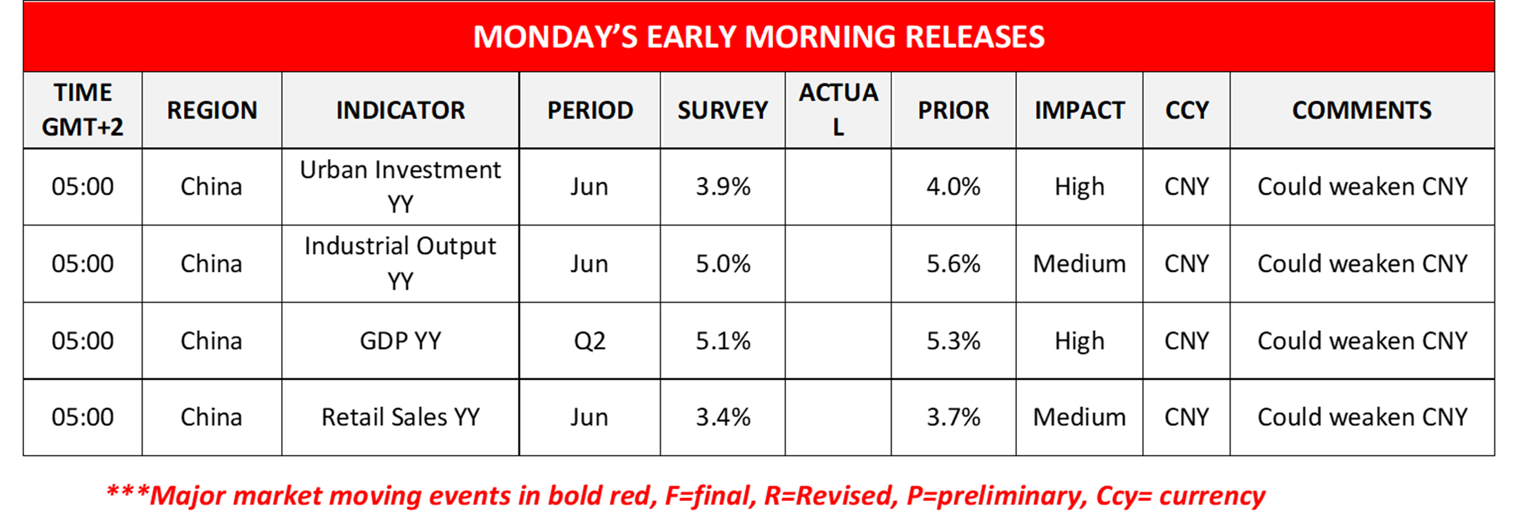 During Monday’s Asian session, we highlight the release of China’s GDP rate for Q2. The rate is expected to slow down and reach 5.1% yoy if compared to Q1’s 5.3% yoy and if actually so the release could be indicative of the problems faced by the Chinese economy in its effort to recover. It should be noted that also China’s urban investment, retail sales and industrial output growth rates for June are to be released at the same time and are also expected to slow down and if so could weigh on the market sentiment, turning it more cautious. Hence, we highlight the possibility of the release also weighing on the Aussie given the close Sino-Australian ties and the exports of Australian raw materials to China.