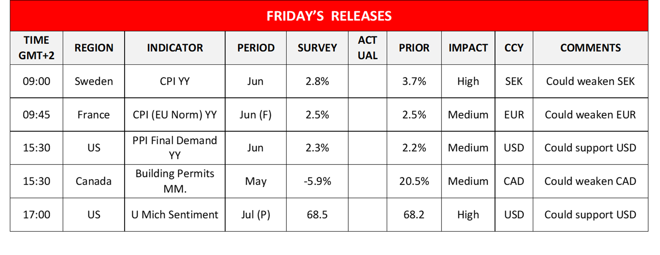During the European session today, we get Sweden’s CPI rates for June and France’s final HICP rate also for June. In the American session, we get from the US also the preliminary University of Michigan consumer sentiment for July as well as Canada’s Building Permits for May.