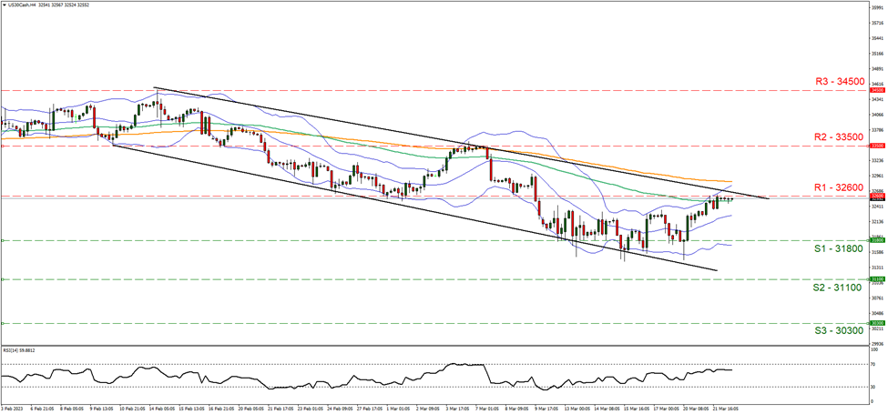 Looking at #US30 4-hour chart we observe the index consolidating around the 31800 (S1) support base over the past week and bouncing higher, closing in the 32600 (R1) resistance barrier ahead of today’s Fed interest rate decision. We hold a sideways bias for the index, ahead of today’s decision, awaiting for the results and advising caution. The RSI indicator below our 4-hour chart that currently registers a reading of 58, which showcases slight bullish sentiment in favour of the index, yet the price action remains bounded between the descending channels’ bounds. Should the bulls take over, we may see the break above the 32600 (R1) resistance level and the upper bound of the descending channel alongside the move of the index closer to the 33500 (R2) resistance barrier. In an extremely volatile scenario we may also see the price action rising closer to the 34500 (R3) level. Should the bears reign over on the other hand, we may see the definitive break below the 31800 (S1) support level and the lower bound of the descending channel, alongside the possible break below the 31100 (S2) support base. Under extreme scenario we may also see the price action heading lower, closer to the 30300 (S3) support range which was last visited during October of 2022.