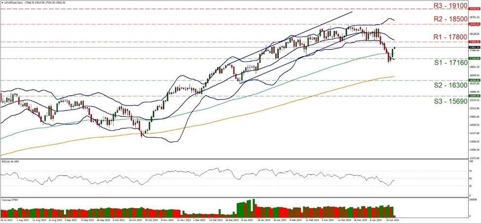 US stock markets as noted before maintained an upward mobility since the start of the week. The easing of market worries for the Middle East tended to allow for a more risk-oriented market approach. Yet the elephant in the room tends to remain the sticky inflation in the US economy and the Fed’s intentions. It should be noted that we have entered a period where a moratorium of statements is imposed on Fed policymakers ahead of the bank’s meeting on the 1a. of May. We see the case for the persistence of inflationary pressures to add more pressure on the Fed to keep rates high for longer and such a scenario may weigh on US stock markets as the tight financial environment is to be maintained, and thus less of opportunities for growth of US companies may emerge. Given that the US employment report and the CPI rates for March have allready been released we note the release of the Core PCE price index for March, on Friday as the next big test. Should the rates fail to substantially slow down, we may see market worries for the Fed intensifying and thus weighing on US stock markets. Also we highlight the release of the preliminary US GDP advance rate for Q1 on Thursday as a possible market mover for US equities.