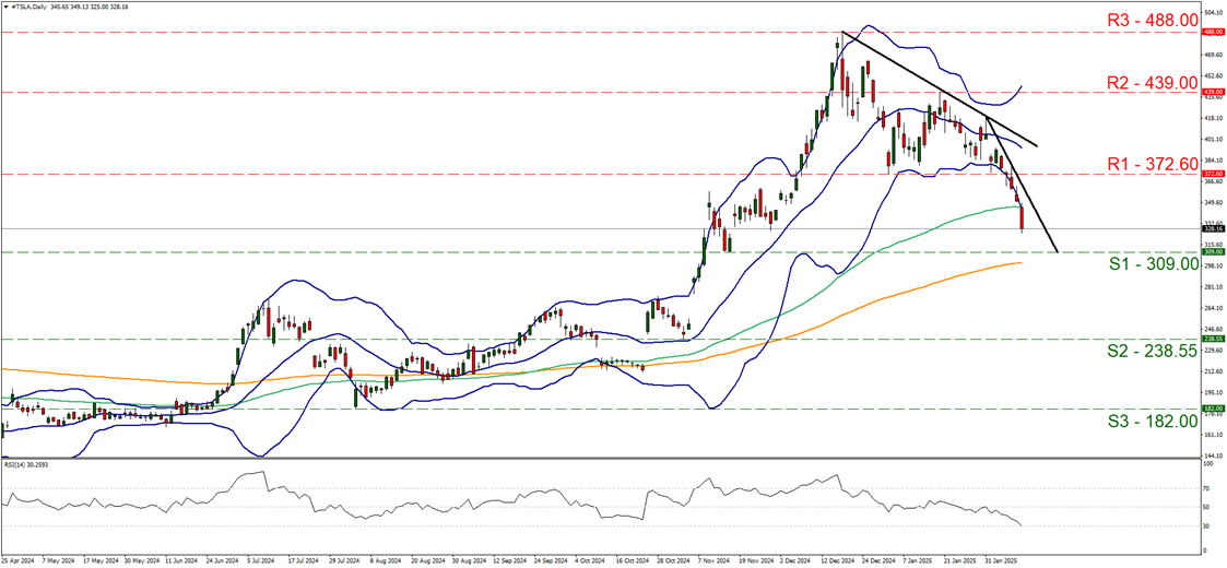 On a technical level, we highlight the drop of Tesla’s share price, as it is currently aiming for the 309.00 (S1) support line. We maintain a bearish outlook for the share’s price as long as it remains below the downward trendline which has steepened its slope since the 31a. of January. We also note that the RSI indicator has reached the reading of 30, implying a strong bearish sentiment on behalf of the market for Tesla’s share price, yet at the same time the indicator may imply that the share’s price is nearing oversold levels and may be ripe for a correction lower. Similar signals are being sent by the fact that the price action has broken the lower Bollinger band. Should the bears maintain control over the share price’s direction, we may see it breaking the 309.00 (S1) support line, a level that has held its ground against downward pressure on the 15a. of November and start aiming for the 238.55 (S2) support level, a level that provided support on the 4a. of November last year. A bullish outlook seems very remote under the current circumstances and for its adoption we would require the share’s price to reverse direction, break initially the prementioned downward trendline in a first signal that the downward motion has been interrupted and continue to break the 372.60 (R1) resistance line and start aiming for the 439.00 (R2) resistance base. Even higher we note the 488.00 (R3) resistance barrier, which marks a record high level for the share’s price.