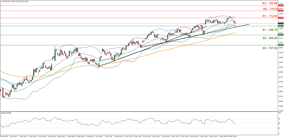 Looking at #AAPL 4Hour chart we observe investors reacting unfavorably to the potential fine that may be imposed by the EU Competition authority and the stock appears to be moving to the 169.75 (S1) support line. We hold a bearish outlook bias for Apple and supporting our case is the RSI figure under our 4Hour chart, which failed to break above the 70 figure and is currently near the 50 figure, implying that a possible shift in the positive momentum, may turn negative. For our bearish outlook to continue, we would like to see a clear break below the 169.75 (S1) support  line with the next potential target for the bulls being the 164.00 (S2) support level. For a bullish outlook, we would like to see a clear break above the 174.90 (R1) resistance with the move towards the 179.35 (R2) resistance ceiling.