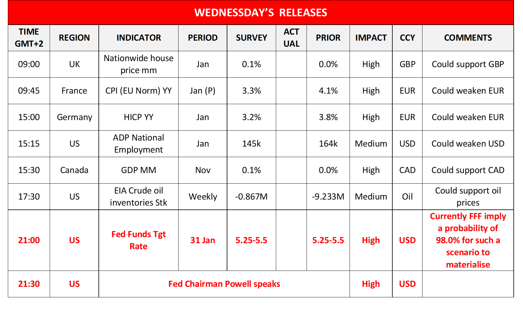In the European session today, we highlight the release of France’s and Germany’s preliminary HICP rates for January and also note the UK’s Nationwide house prices for the same month. As the American session is about to start, we note the release of the US ADP national employment figure for January and Canada’s GDP rate for November, while later on, oil traders may be more interested in the release of the US EIA weekly crude oil inventories figure. During tomorrow’s Asian session, we note the release of Australia’s and Japan’s final January PMI figures for the manufacturing sector, while from Australia, we also get December’s building approvals growth rate and also note the release of China’s Caixin manufacturing PMI figure for January.