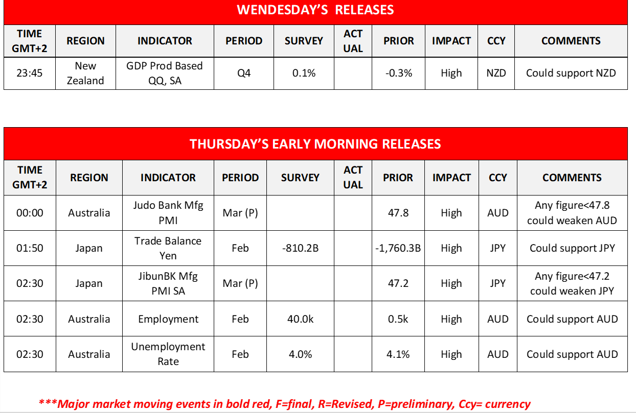 Today in the European session we note the release of Germany’s PPI rates for February, and we highlight UK’s CPI and PPI rates for the same month, while on the monetary front, we note CNB’s interest rate decision while ECB President Christine Lagarde speaks. In the American session, we get EIA’s weekly Crude oil inventories figure, Eurozone’s preliminary Consumer confidence for March and later on New Zealand’s GDP rate for Q4 and on the monetary front, besides the Fed’s interest rate decision we also note the release from Canada’s BoC March meeting minutes. On Thursday’s Asian session, we get Japan’s trade data for February and we highlight Australia’s employment data for February.