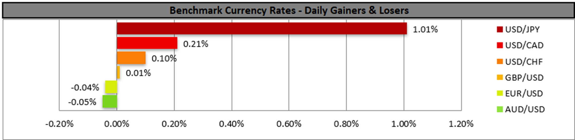 In the FX market, we note the rise of USD/JPY as the pair broke the 150.85 (S1) resistance line, now turned to support and is currently aiming for the more than thirty-year high of 152.00 (R1) resistance line. We tend to maintain a bullish outlook for the pair as long as the upward trendline guiding the pair remains intact. We also note that the RSI indicator remains far higher than the reading of 70, which highlights the bullish sentiment of the market for the pair, yet at the same time may imply that the pair is at overbought levels and may be ripe for a correction lower.