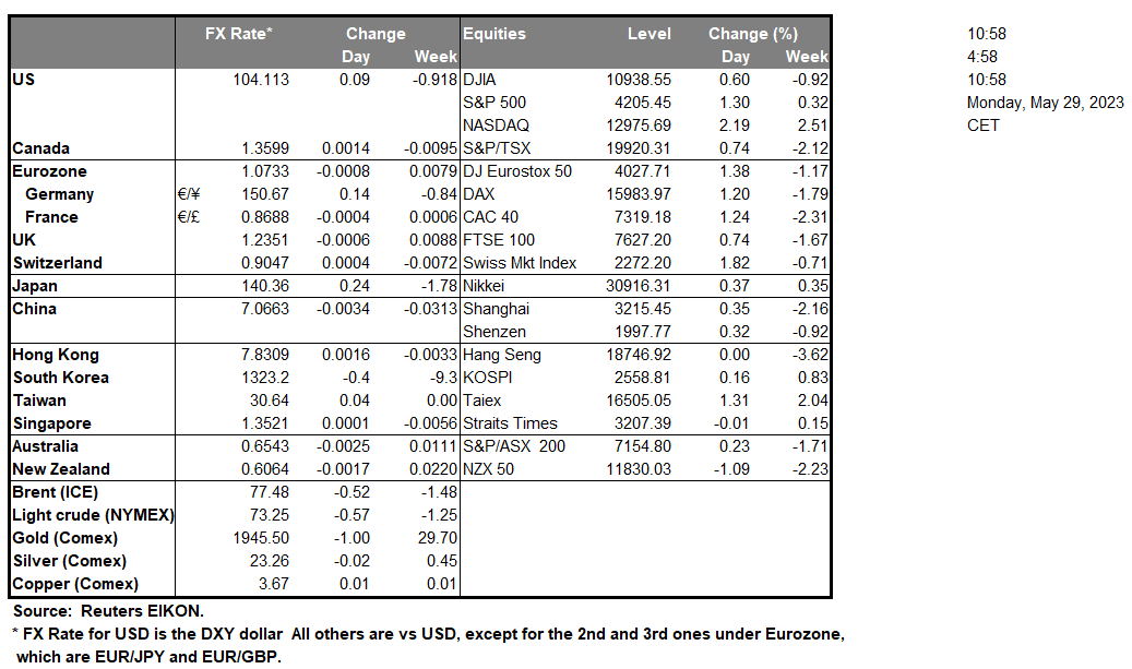 In a rather easy-going Monday with no major financial releases expected, we tend to turn our attention towards fundamentals, seeking more guidance as for the direction of the markets. Market sentiment seems to have been reversed to the positive, amidst growing optimism about a possible deal between the White House and the House of Representatives about the US debt ceiling. The positive sentiment may grow further as Biden stated that the final debt ceiling deal is ready to be moved to Congress for a vote, yet US Treasury Secretary Yellen stated that Congress has to resolve the issue by June 5th setting the deadline. For the time being, we expect that should the improved market sentiment be extended, riskier assets may get some support, yet we would also like to note on second base the market’s worries for the Fed’s rate hiking path which could moderate the risk on sentiment, while we note that today US stockmarkets are to be closed.