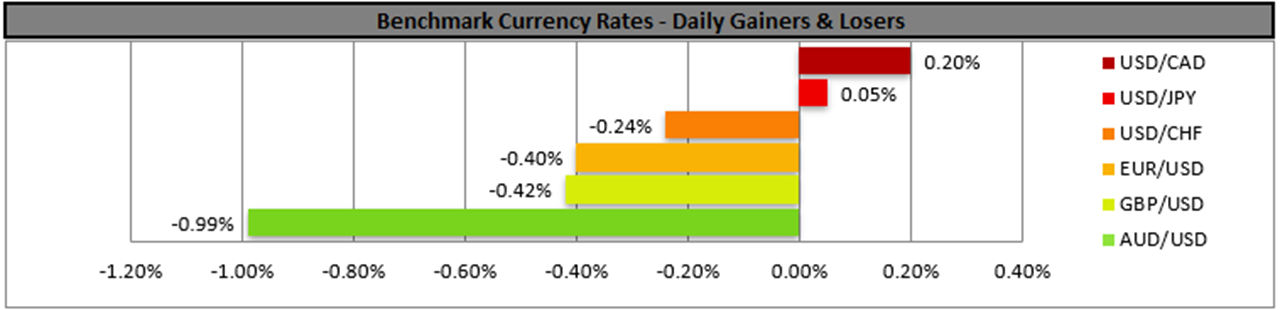 Across the channel, cable also tended to maintain some bearish tendencies, as the pair is aiming for the 1.2375 (S1) support line. Also given that the RSI indicator remains close to the reading of 30, implying a bearish market sentiment for GBP/USD, and the 20 moving average (MA) has crossed the 100 MA and is about to cross also the 200 MA, implying an intensification of the pair’s downward movement. Should the selling interest be maintained we may see the pair breaking the 1.2375 (S1) support line and aiming for the 1.2205 (S2) support base. Should on the other hand buyers take control over the pair’s direction, we may see cable reversing direction, breaking the 1.2480 (R1) resistance line and aiming for the 1.2600 (R2) hurdle.
