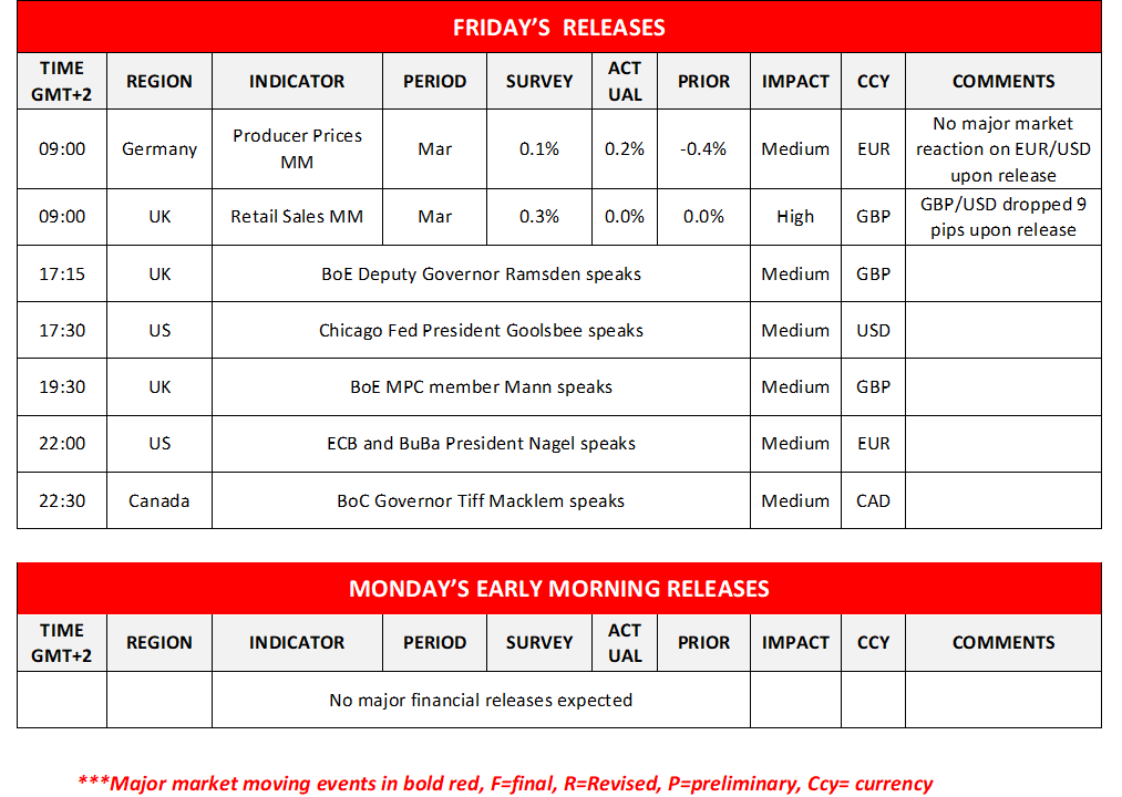On a fundamental level we note that cautiousness tended to characterize the markets as worries for an escalation in the conflict in the Middle East are intensifying. It seems that Israel has launched a retaliatory air strike on Iran yesterday, with explosions being heard at Isfahan, a city in central Iran, while drones were reported to have been downed. Yet media for the time being do not seem to make a fuss of it, in overall an effort to de-escalate the situation. It should be noted that oil prices were able to rise during the late American session yesterday and during today’s Asian session, on concerns regarding the supply side of the commodity. On the flip side, riskier assets such as the Aussie and to a wider degree US stock markets tumbled. US stock markets may also keep an eye out for the earnings season and we intend to focus on the earnings release of Procter & Gamble today (#PG). Should market worries start easing we may see yesterday’s movements being reversed, yet in any case the market remains very sensitive with the possibility of unexpected moves being on the horizon. In the FX market we note that UK’s retail sales growth rate for March failed to accelerate while on a core level even contracted, implying a weakness on the demand side of the UK economy , which tended to weigh on the pound a bit, while in Germany the PPI rate seems to have edged higher for March implying some persistence of inflation at a producers level.
