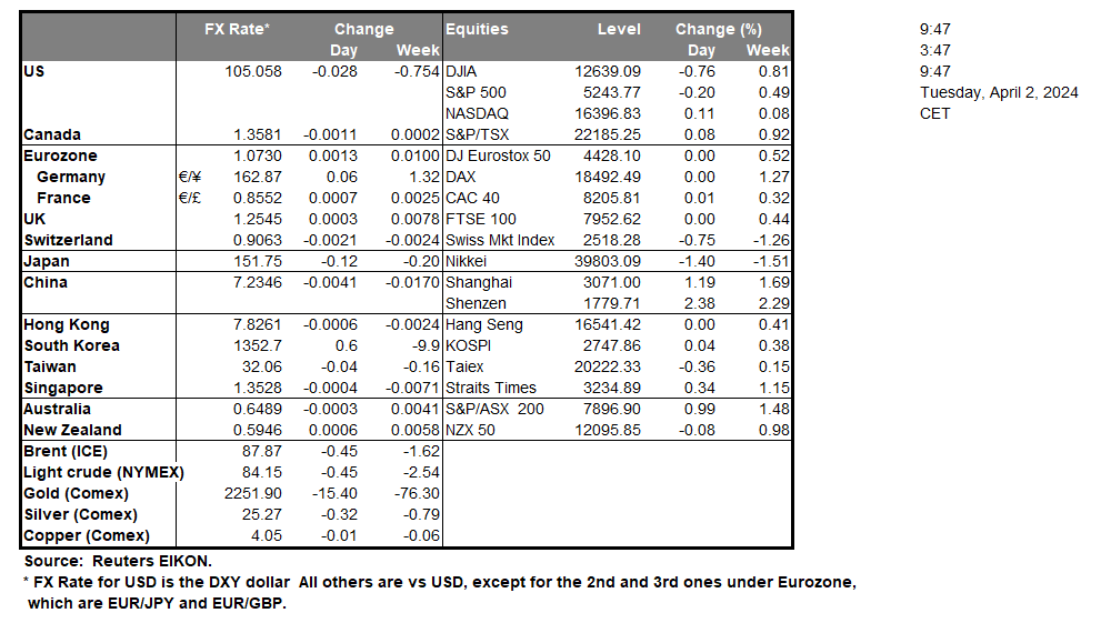The USD tended to gain against its counterparts yesterday, as a better-than-expected reading for the ISM manufacturing PMI figure for March was released. The release implied an expansion of economic activity for the US manufacturing sector, the first since October 2022. On the monetary front we may see Fed policymakers pushing back against market expectations for the bank to proceed with rate cuts from June onwards which may also provide some support for the greenback. To that end we note Cleveland Fed President Mester, a well-known hawk among Fed policymakers and we would not be surprised to see San Francisco Fed President Daly making similar remarks. It’s notable that despite USD’s ascent, gold’s price also tended to maintain breaking the classic negative corelation of the two trading instruments . Today we note the release of the JOLTS Job openings for February, and we also highlight the release of the US factory orders growth rate for the same month.