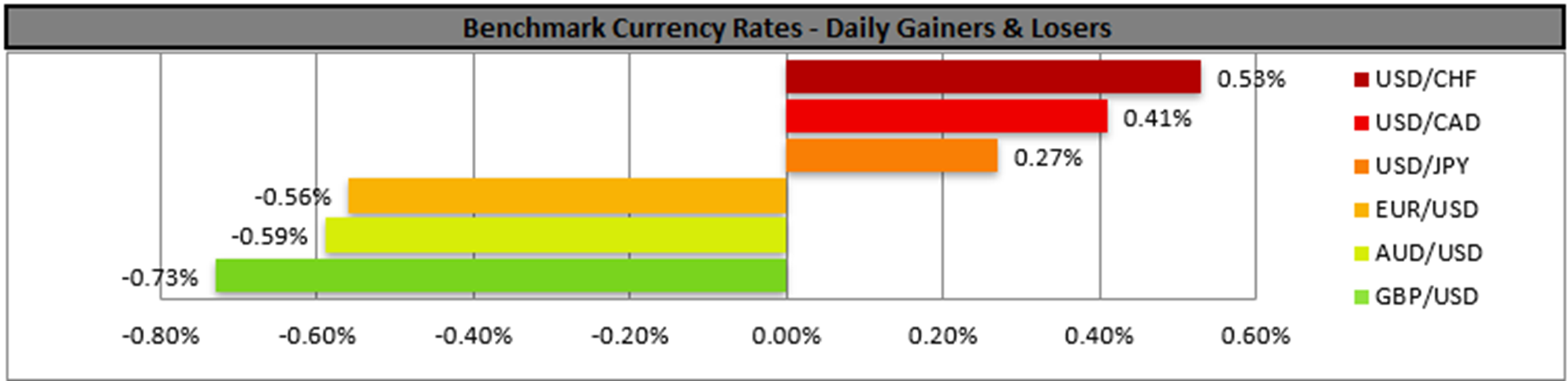 GBP/USD fell yesterday, breaking the 1.2600 (R1) support line, now turned to resistance. We tend to maintain a bearish outlook for the pair given that the downward trendline guiding the pair remains intact and the RSI indicator remains near the reading of 30, implying a strong bearish sentiment in the market for the pair. Should the selling interest be maintained, we may see cable breaking the 1.2480 (S1) line aiming for the 1.2375 (S2) support base . Should buyers take over ,we may see GBP/USD breaking the 1.2600 (R1) resistance line, breaking also the prementioned downward trendline in a first signal that the downward motion has been interrupted, and take aim of the 1.2760 (R2) resistance hurdle.