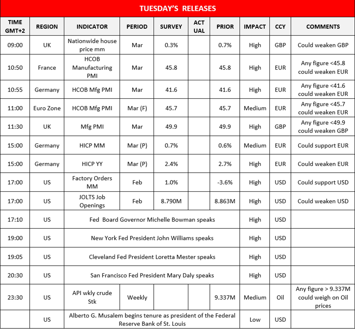 Today we note France’s, Germany’s and the Eurozone’s manufacturing PMI all for March. Oil traders on the other hand may be more interested in the release of the US API weekly crude oil inventories figure. In tomorrow’s Asian session we note Japan’s Jibunk Final services and composite PMI figures for March, followed by China’s Caixin Services PMI figure also for March. On a monetary level, we note the speeches by Fed Board Governor Bowman, New York Fed President Williams, Cleveland Fed President Mester, and San Francisco Fed President Daly. On another note, we highlight that Alberto G. Musalem begins his tenure as St. Louis Fed President.