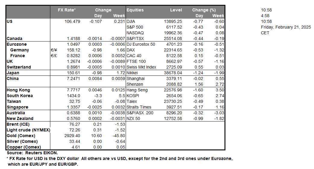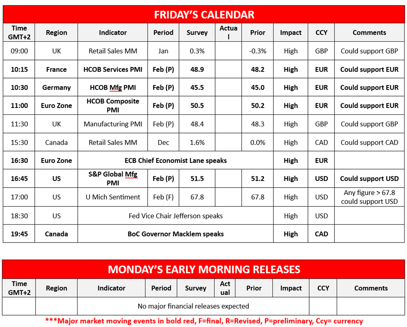 Today we get the UK’s retail sales rate for January, France’s preliminary services PMI figure, Germany’s preliminary manufacturing PMI figure and the Eurozone’s preliminary composite PMI figure all for the month of February in addition to the UK’s preliminary manufacturing PMI figure for February. In the American session, we note Canada’s retail sales rate for December, the US S&P preliminary manufacturing PMI figure and the US final University of Michigan consumer sentiment figure both for February. On a monetary level, we note the speeches by ECB Chief Economist Lane, Fed Vice Chair Jefferson and BoC Governor Macklem.