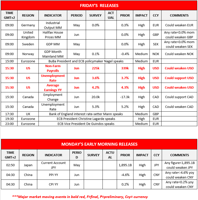 In today’s European session we note the release of Germany’s industrial output for May, UK’s Halifax House prices for June, Sweden’s and Norway’s GDP for May while we also note that BuBa President and ECB policymaker Nagel speaks. In the American session besides the US and Canada’s June employment data, we also note that Bank of England interest rate-setter Mann, ECB President Christine Lagarde and ECB Vice President De Guindos are scheduled to speak. During Monday’s Asian session, we note the release of Japan’s current account balance for May and China’s inflation metrics for June.