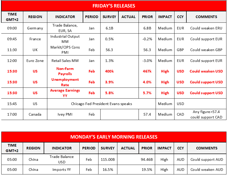 Should the actual rates and figures actually meet their respective forecasts, we may see the USD getting some support as despite the drop of the NFP figure the number remains high and in the positives, implying that the US employment market was able to create a substantial number of new jobs in February, while the tick down of the unemployment rate implies that the US employment market is still tightening. The possible acceleration of the average earnings growth rate for February if realized would imply that the inflationary pressures could intensify further. The importance of the release was highlighted last Friday as Fed Governor Waller stated that “if, for example, tomorrow’s PCE inflation report for January, and jobs and CPI reports for February indicate that the economy is still running exceedingly hot, a strong case can be made for a 50-basis-point hike in March”.