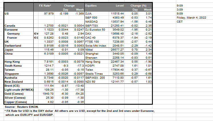 As the war in Ukraine rages on, the USD benefited by strengthening further against a number of its counterparts yesterday, while US Stockmarkets seem to be losing ground during today’s Asian session. It should be noted that the second round of negotiations between Russia and Ukraine ended without the two sides achieving a ceasefire. Also please note that Fed Chairman Powell yesterday stated that the Ukraine creates risks for higher inflation. Main market focus though of the market tomorrow is expected to be on the release of the US employment report for February. The NFP figure is expected to drop while the unemployment rate is forecasted to tick down and finally the average earnings growth rate is expected to accelerate.