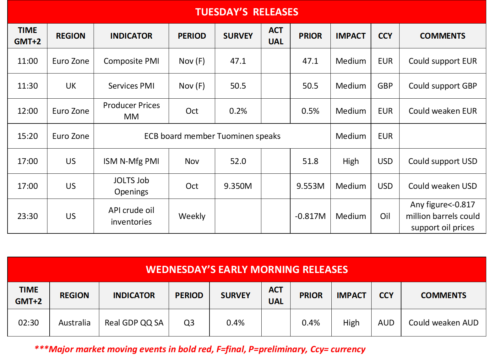 Today in the European session, we get the Eurozone’s final composite PMI and US final services figures for November and the Eurozone’s producer prices for October and on the monetary front ECB board member Tuominen speaks. In the American session, we get the US ISM non-manufacturing PMI for November, and the JOLTS job openings figure for October, while later on, oil traders may be more interested in the release of the weekly API crude oil inventories. During tomorrow’s Asian session, we get Australia’s GDP rate for Q3.