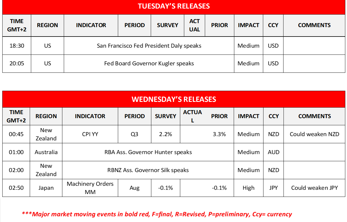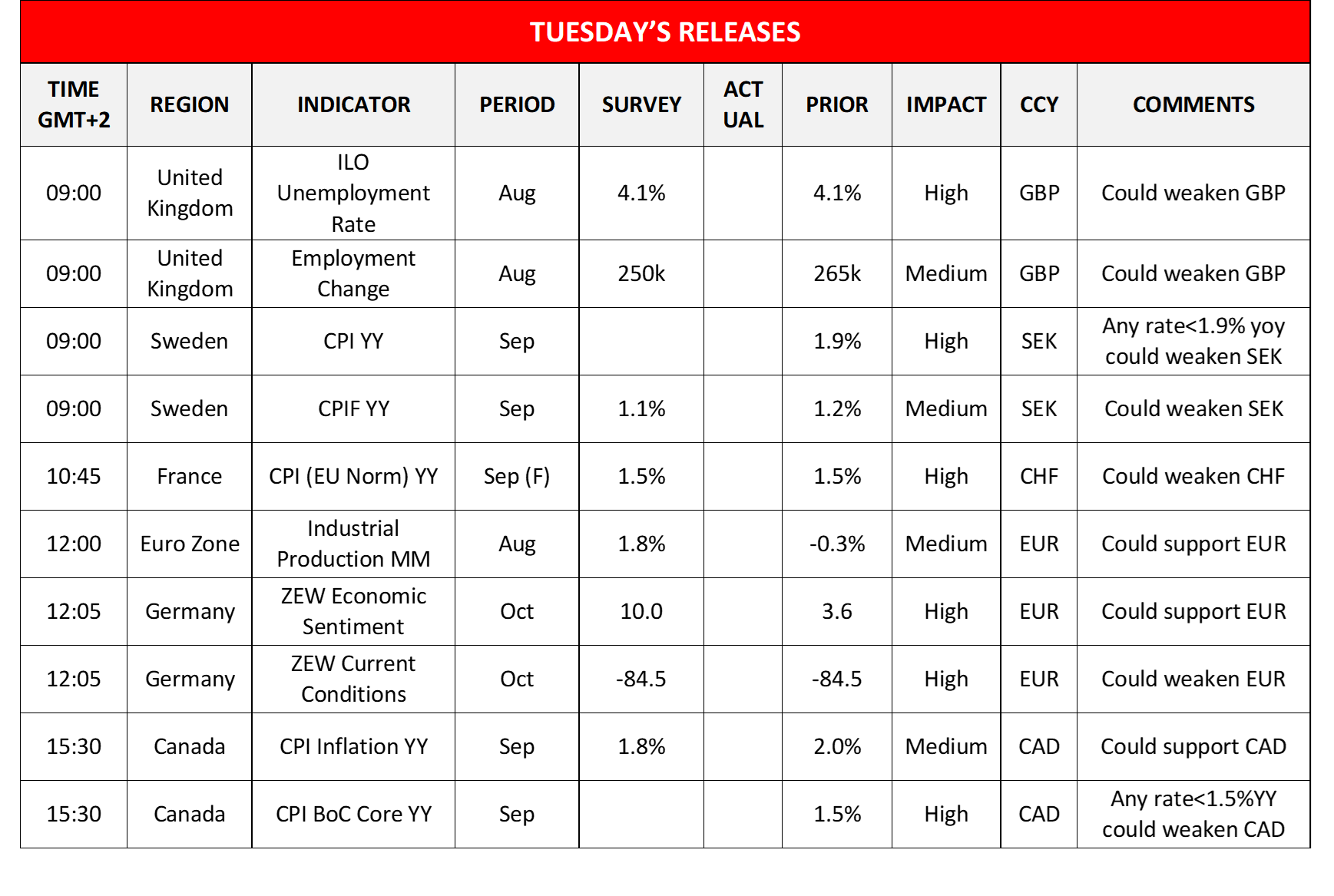 Today in the European session, we get UK’s employment data for August, Sweden’s CPI rates for September, France’s CPI rates for September, Eurozone’s industrial production rate for August and Germany’s ZEW indicators for October. In the American session besides Canada’s September CPI rates, we also note that San Francisco Fed President Daly and Fed Board Governor Kugler are scheduled to speak. During tomorrow’s Asian session, we get New Zealand’s CPI rates for Q3 and Japan’s Machinery orders for August, while RBA Ass. Governor Hunter and RBNZ Ass. Governor Silk speak.