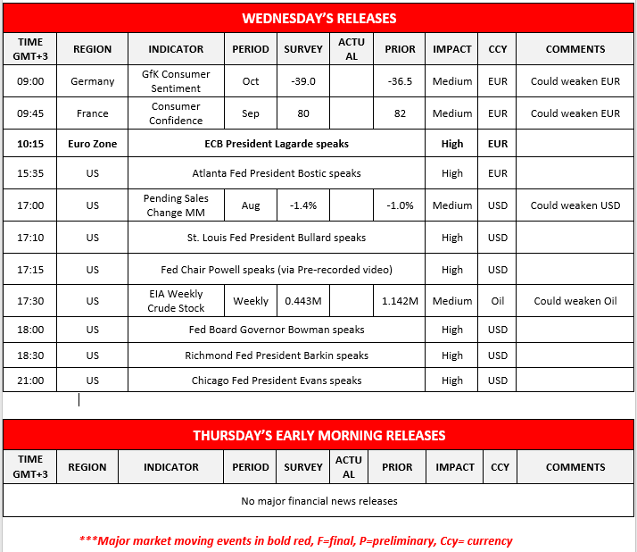 A parade of Fed policy makers deliver speeches today namely the Atlanta Fed President Bostic, St. Louis Fed President Bullard, Fed Board Governor Bowman, Richmond Fed President Barkin and Chicago Fed President Evans and the market will be watching for any clues or deviations from the so far, unified ‘curbing inflationary pressures at all costs’ narrative. Should Fed speakers deliver their hawkish commentary as expected we may see the dollar continue to reign supreme. Furthermore, Fed Chair Powell is also scheduled to deliver a speech today and it is expected to maintain its hawkish stance. As for financial releases today, we would note from the US the release of the Pending home sales for August and the rate is expected to show another contraction which may weigh on the greenback, hinting at a discouraged US housing market amidst a period of persistently higher inflationary pressures.