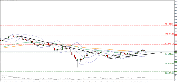 Oil participants tend to maintain their worries for the demand outlook of the commodity especially as market worries for a possible default of the US on its debt seem to intensify. It should be noted that Republican lawmakers are to leave for a long weekend today, which lowers the chances for an agreement between the White House and the House of Representatives in the next few days. Nevertheless, House Speaker McCarthy stated that he could get a deal on raising the Debt ceiling “in principle” by this weekend. Please note that the ongoing negotiations and the lack of common ground, caused Fitch to place the US “AAA” rating under credit watch negative. The development intensified market worries further and understandably oil traders fear for the possible adverse effect such a scenario may have on oil prices. Furthermore the news that Germany a key industrial economy that still consumes a considerable amount of oil fell into a recession even a technical one, tended to intensify market worries for the demand side of the economy. It should be noted that the contraction of economic activity in Germany’s manufacturing sector over the past 10 months may enhance such worries which in turn may weigh on oil’s price.