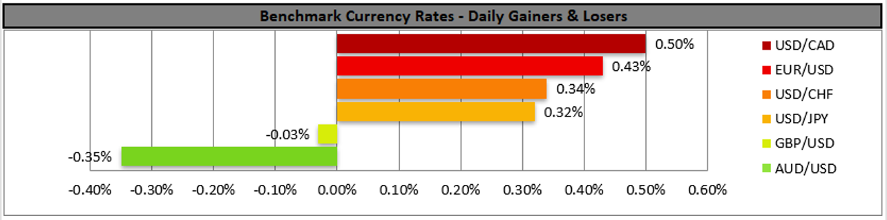 USD/CAD had a strong upward movement yesterday breaking the 1.2855 (S1) resistance line now turned to support. We maintain a bullish outlook for the pair as long as it remains above the upward trendline incepted since the 3rd of March. Please note that the RSI indicator below our 4-hour chart is at the reading of 70 which on the one hand confirms the bull’s dominance, yet on the other may imply that the pair has reached overbought levels and is ripe for a correction lower. Should the bulls maintain control over the pair we may see USD/CAD breaking the 1.2945 (R1) resistance line and aim for the 1.3025 (R2) level. Should the bears take over, we may see the pair breaking the 1.2855 (S1) support line and aim for the 1.2785 (S2) level.