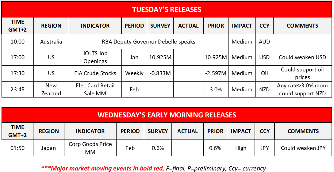 Today in the European session RBA Deputy Governor Debelle is scheduled to speak while in the American session, we note the release of the Jolts Job Openings for January and the weekly EIA crude oil inventories figure. Later on we note the release of New Zealand’s electronic card retail sales and during tomorrow’s Asian session we get from Japan the corporate goods prices growth rate for February.