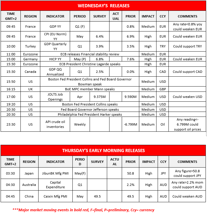 During today’s European session, we note the release of France’s final GDP rate for Q1, France’s preliminary HICP rate for May, Turkey’s GDP rate for Q1 and Germany’s GDP rate for Q1. On the monetary front, we note that ECB releases the financial stability review while ECB President Christine Lagarde speaks. In the American session, we note the release of Canada’s GDP rate for Q1 and the US JOLTS job openings for April, while oil traders may be more interested in the release of the weekly API crude oil inventories figure. On the monetary front we note that Boston Fed President Collins, Fed Board Governor Bowman, BoE MPC member Mann, Fed Board Governor Jefferson and Philadelphia Fed President Harker are scheduled to speak. During tomorrow’s Asian session, we get Japan’s final manufacturing PMI figure for May, Australia’s capital expenditure for Q1 and we highlight from China the Caixin manufacturing PMI figure for May.