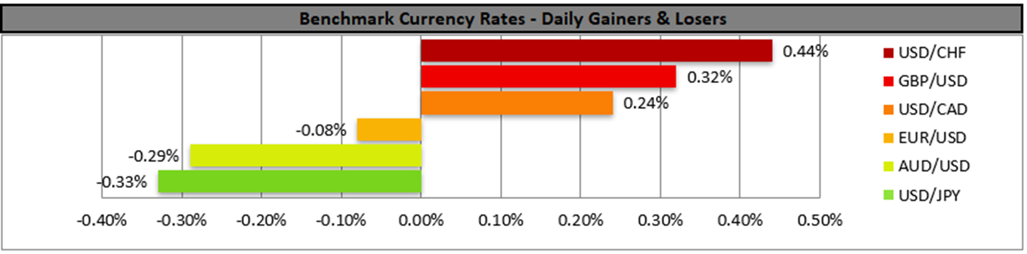 On a technical level it was characteristic that EUR/USD maintained its downward trajectory, despite the weakening of the USD and is currently about to test the 1.0675 (S1) support line. We maintain our bearish outlook for the pair as long as the downward trendline remains intact and given that the RSI indicator has dropped, nearing the reading of 30. Should the selling interest be maintained we may see EUR/USD breaking the 1.0675 (S1) support line and aim for the 1.0575 (S2) support level. Should the pair on the other hand find extensive buying orders along its path, we may see the pair reversing course, breaking the prementioned downward trendline, in a first sign that the downward movement of the pair has been interrupted and aim if not breach the 1.0760 (R1) resistance level.