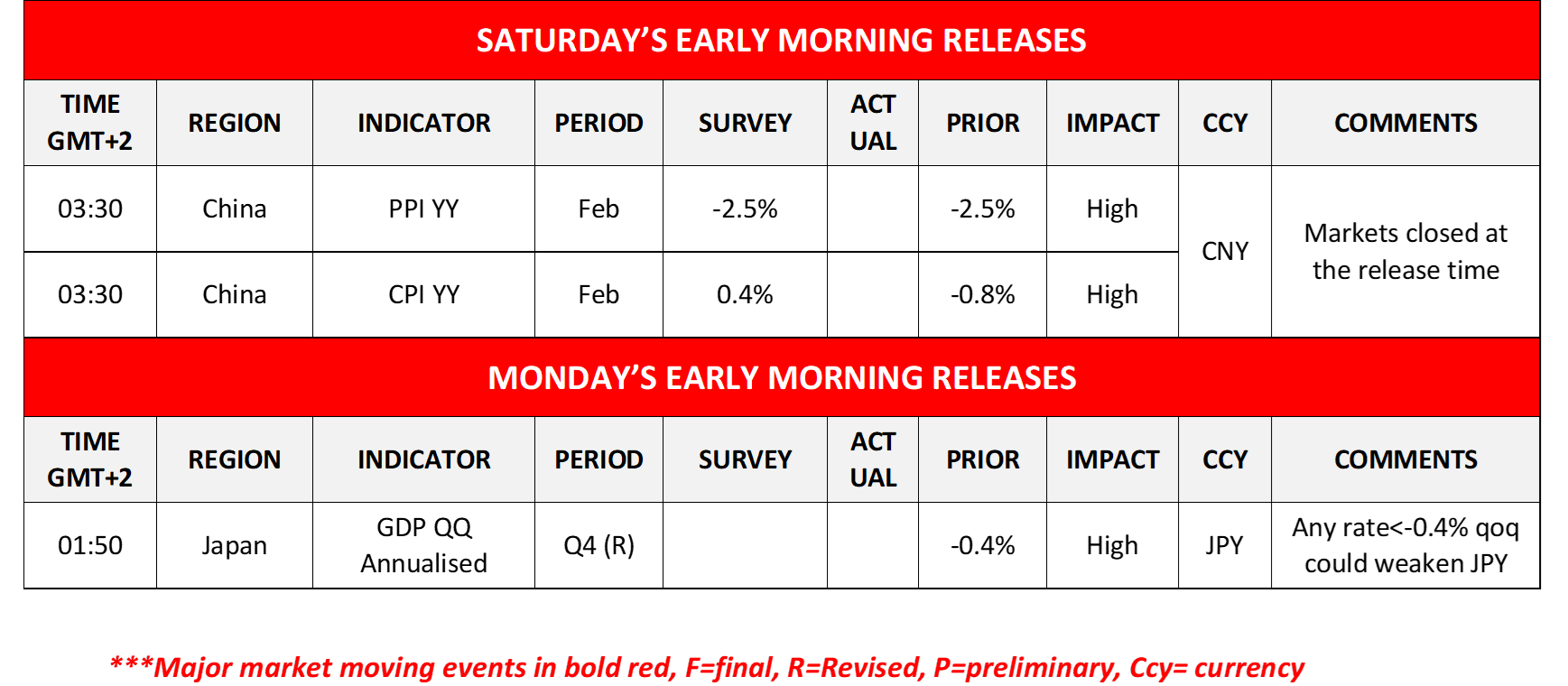 Today in the European session, we note the release of Germany’s industrial output for January, Sweden’s GDP rate for January and the Eurozone’s revised GDP rate for Q4. On Saturday we note the release of China’s inflation metrics for February, while during Monday’s Asian session, we get the revised GDP rate of Japan for Q4.