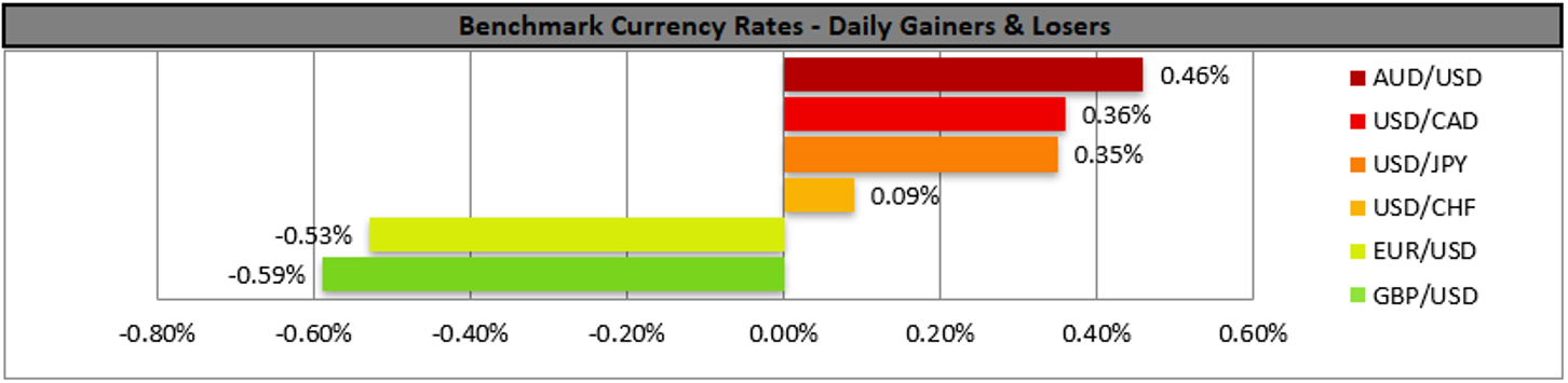 The USD index rose yesterday yet seemed to hit a ceiling at the 111.50 (R1) resistance line. We do expect the index to stabilize for now and a range bound motion to prevail as the upward momentum seems to have been stopped. Should the index find fresh buying orders along its path we may see it breaking the 111.50 (R1) resistance line and aim for the 112.60 (R2) level. Should on the other hand a selling interest be expressed, we may see the index breaking the 110.50 (S1) support line and aim for the 110.00 (S2) support level.