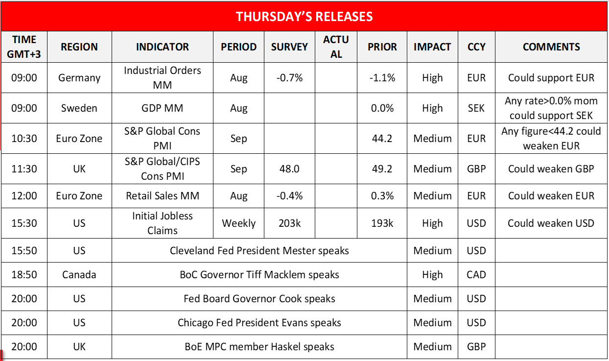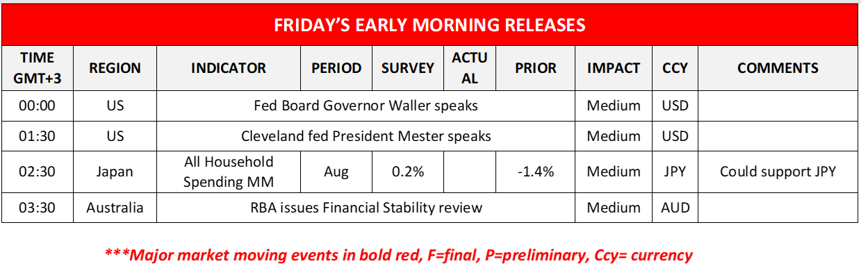 Today in the European session, we note the release of Germany’s industrial orders, Sweden’s GDP rates for August and the construction PMI figure for September of the UK and the Eurozone. In the American session we note the release of the weekly US Initial jobless claims figure. On the monetary front we note the planned speeches of Cleveland Fed President Mester, Fed Board Governor Cook, Chicago Fed President Evans, BoC Governor Tiff Macklem and BoE MPC member Haskel. During tomorrow’s Asian session we get Japan’s All household spending growth rate for August, while Fed Board Governor Waller and Cleveland Fed President Mester are scheduled to speak while RBA is to release its Financial Stability review.