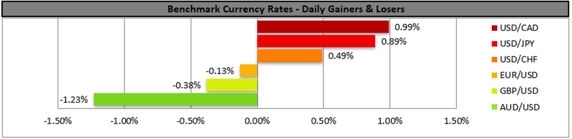 On a technical level, we are to examine the behaviour of the USD against a commodity currency and a safe haven today. Starting with the Aussie, AUD/USD after hitting a ceiling at the 0.6900 (R1) resistance line, started to drop and broke the 0.6835 (R1) support line, now turned to resistance. We expect the downward motion to continue, yet we would prefer the RSI indicator to drop below the reading of the 50 and start aiming for 30, verifying the bearish sentiment of the market. Should the bears maintain control over the pair we may see it breaking the 0.6770 (S1) support line and aim for the 0.6700 (S2) support level. Should the bulls take over, we may see the pair reversing course, breaking the 0.6835 (R1) resistance line and aim for the 0.6900 (R2) resistance level.