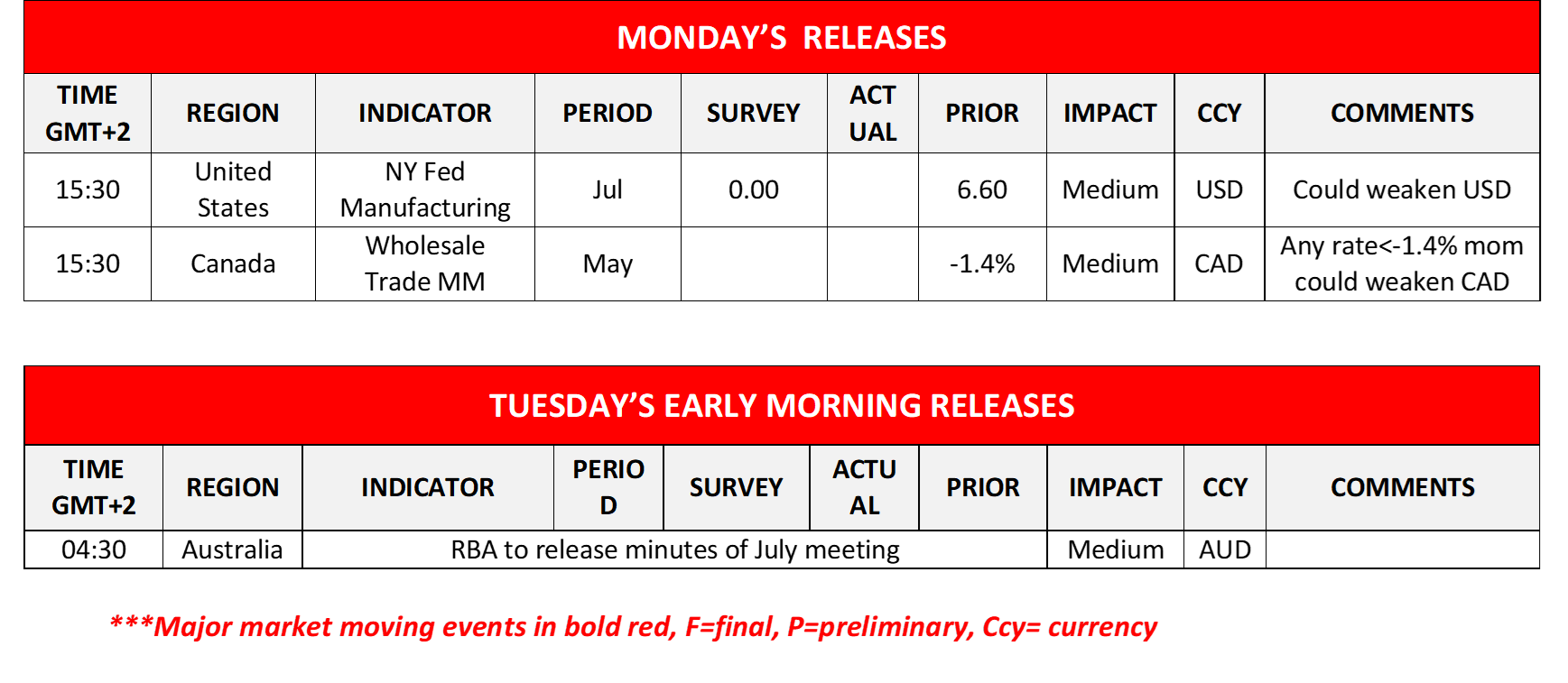 In a rather ease going Monday, we note in the American session, the release from the US of the NY Fed manufacturing Index for July and from Canada the wholesale trade growth rate for May. During tomorrow’s Asian session, please note the release from Australia of RBA’s July meeting minutes.