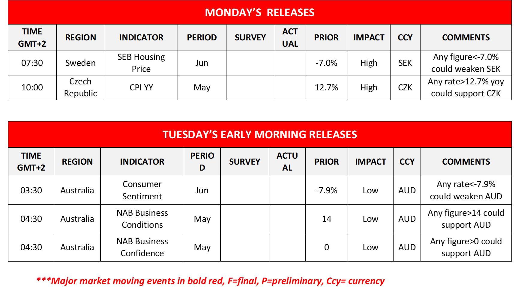 In today’s European session, we note the release of Sweden’s SEB Housing Prices for June and from the Czech Republic the CPI rates for May. During tomorrow’s Asian session, we note the release from Australia of the Consumer confidence indicator for June and the NAB Business Confidence and Business Conditions indicators for May.