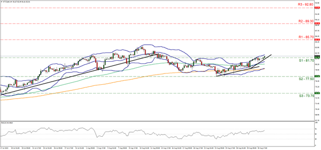 WTI’s price has been moving in an upward fashion in the past week, covering the distance from the 77.50 (S2) support line and breaking the 81.70 (S1) resistance line, now turned to support. We tend to maintain a bullish outlook for the commodity’s price given its upward movement which formed an upward trendline that has steepened its slope in the past 48 hours. Yet also the fact that the RSI indicator has risen and is currently aiming for the reading of 70, is implying a bullish sentiment among market participants for oil’s price. Should the upward movement of WTI’s price be maintained in the coming week, we set as the next target for the bulls the 85.70 (R1) resistance line. Should the bears take over, we may see WTI’s price dropping, breaking the prementioned upward trendline, signaling the interruption of the upward movement, breaking the 81.70 (S1) support line and aim if not breach the 77.50 (S2) support level.