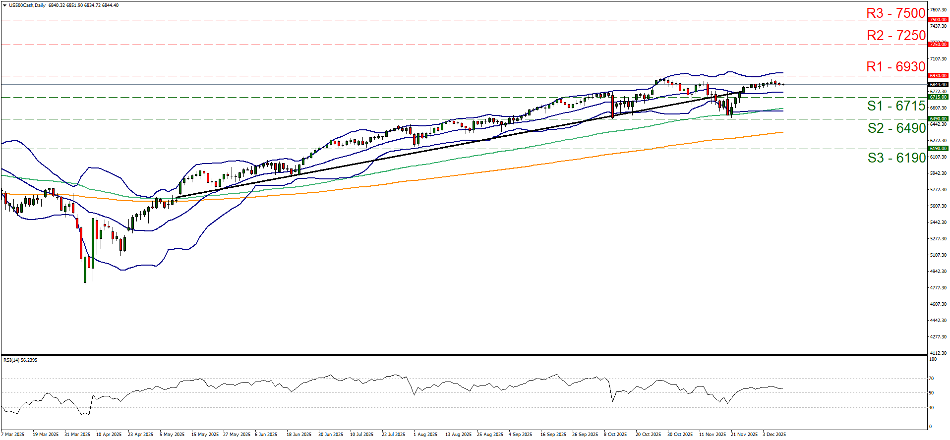 On a technical level, we note that since our last report S&P 500 seems to have stabilised, maintaining a sideways motion just below the 6930 (R1) resistance line. We tend to maintain a bias for the sideways motion to be maintained at the current stage, possibly between the 6930 (R1) resistance line and the 6715 (S1) support level. The RSI indicator remains close to the reading of 50, just above it, implying a relative indecisiveness on behalf of traders about the future direction of the index’s price action. Should the bulls take over, we may see S&P 500 breaking the 6930 (R1) resistance line which marks a record high level for the index and we set as the next possible target for the bulls the 7250 (R2) resistance level. Should the bears take over, we may see the index’s price action breaking the 6715 (S1) support line and start aiming for the 6400 (S2) support level.