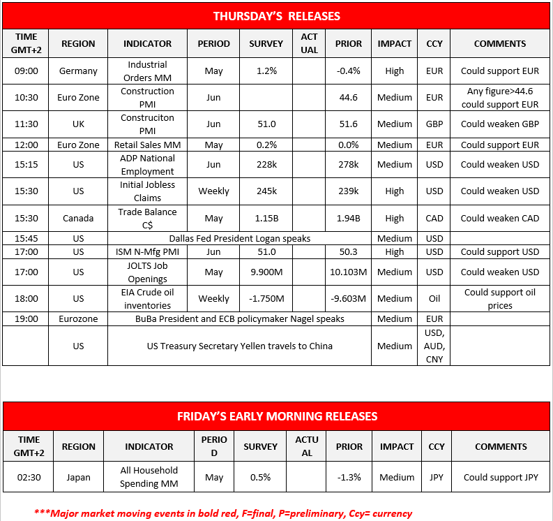 In today’s European session we note the release of Germany’s industrial orders for May, Eurozone’s and the UK’s construction PMI figures for June and the Eurozone’s retail sales growth rate for May. In the American session, we note the release of the US ADP national employment figure for June, the weekly initial jobless claims figure, Canadas’ trade data for May, the US ISM non-manufacturing PMI figure for June, the US JOLTS job openings figure for May, while oil traders may be more interested in the release of EIA weekly crude oil inventories figure. On the monetary front we note that Dallas Fed President Logan is scheduled to speak as is ECB policymaker Nagel. On a more fundamental level, we note US treasury Secretary Yellen’s trip to China. During tomorrow’s Asian session, we note from Japan the All-household spending growth rate for May.
