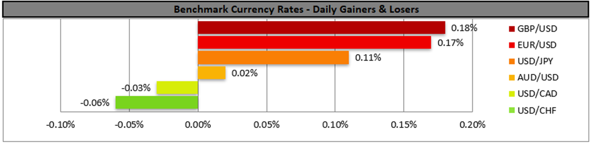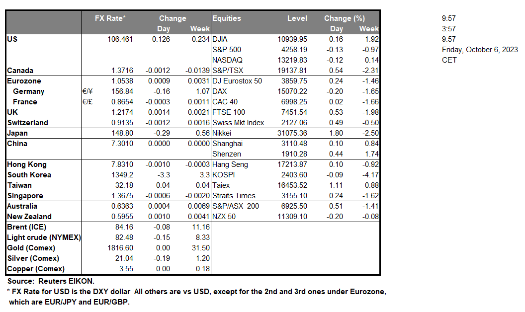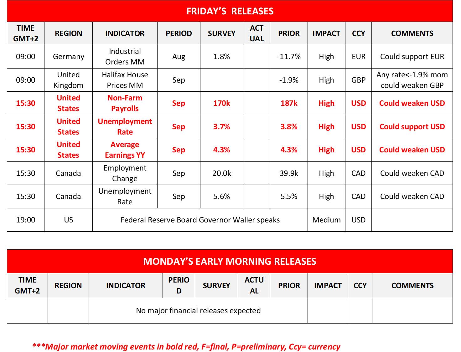 The USD edged lower against its counterparts yesterday, ahead of the release of September’s US employment report. We note that the market’s expectations for a possible drop in the NFP figure may have been enhanced after the release of the ADP figure which dropped beyond market expectations. Currently, market expectations are for the NFP figure to drop to 170k, if compared to August’s 187k an element that may weaken the USD as it implies that the ability of the US employment market to create new jobs is fading, while the unemployment rate is expected to tick down to 3.7%, reminding us that the US employment market remains tight and thus supporting the USD. We tend to view risks related to the release as titled to the downside, and should the actual rates and figures imply a wider-than-expected crack in the US employment market’s tightness we may see the USD slipping as the data may also solidify the market’s expectations for the Fed to remain on hold in its coming meeting. Yet we also note that there is wide uncertainty for the actual rates and figures to be released and tend to advise caution. We highlight that the release may have wider ripple effects beyond the FX market and should data show an easing of the US employment market we may see support rising for US stock markets and gold’s price and vice versa.