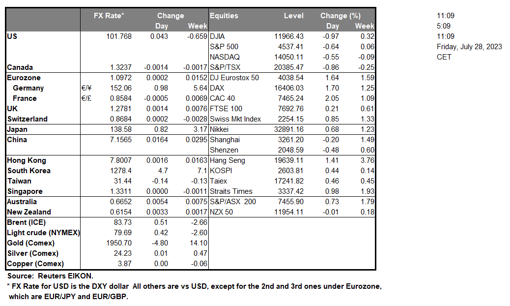 Across the pond, EUR traders are expected to have a busy day ahead. On the monetary front, the ECB yesterday delivered a 25-basis points rate hike as was expected, yet in its accompanying statement the bank stated that “The developments since the last meeting support the expectation that inflation will drop further over the remainder of the year but will stay above target for an extended period”. Yet overall and in contrast to the market’s marginal expectations for another rate hike in the September meeting, the bank allowed for increased doubt for such a scenario, as ECB President Lagarde characterized the future decision as a “decisive maybe”. The release was clearly less on the hawkish side and tended to weaken the common currency. EUR/USD dropped yesterday breaking the 1.1020 (R1) support line, now turned to resistance. We tend to switch our outlook for the pair towards a bearish one, given also that the RSI indicator has reached the reading of 30 implying a strong bearish sentiment on behalf of the market, yet there seems to be some easing of the bearish tendency. Should the bears maintain control over the pair, we may see EUR/USD breaking the 1.0920 (S1) support line and aim for the 1.0835 (S2) support level. Should the bulls take over, we may see the pair reversing course breaking the 1.1020 (R1) resistance line and aim for the 1.1145 (R2) base.