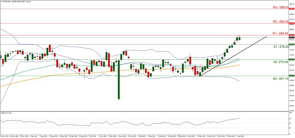 Looking at #MCD Daily chart we observe investors react favorably to the employee reduction announcement, flooding the stock with calls, pushing the stock’s price to all-time highs. We hold a bullish outlook bias for McDonalds, given the formation of an upwards trendline since the 10th of March and today’s fresh all-time high level. Supporting our case is the RSI indicator below our daily chart which currently stands at 70, indicating a strong bullish sentiment surrounding the the golden arches. Furthermore, the RSI indicator staying at 70 may signal that the bulls are eager and are actively trying to push prices higher ground. Should the bulls extend their reign, we may see the break above the 283.45 (R1) resistance level and the move towards the 290.00 (R2) resistance barrier. For a bearish outlook we would like to see a clear break below the 278.25 (S1) support level with the next possible target for the bears being the 270.05(S2) support base.