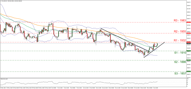 Gold’s price has ended its downward movement and seems to be rising as it takes aim of the 1932 (R1) resistance line. We tend to be bullish for the outlook of the precious metal’s price on a เทคนิค level as long as the price action remains above the upward trendline which has started to form since the 30th of June.